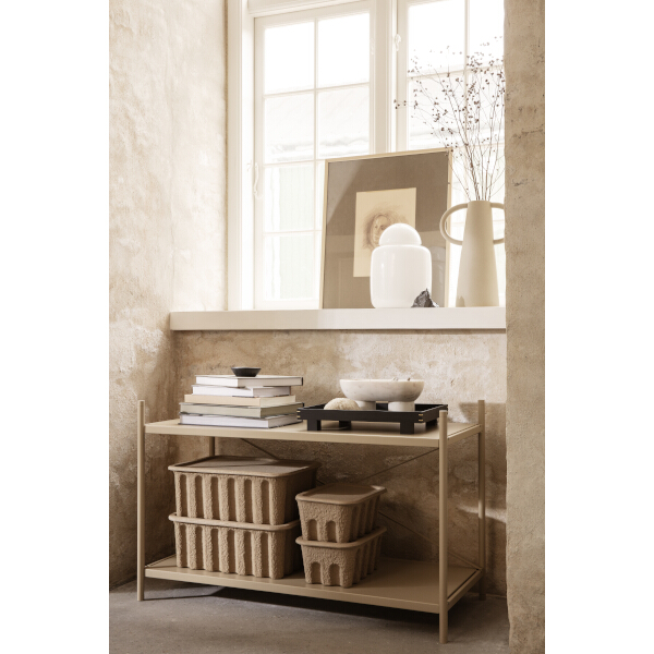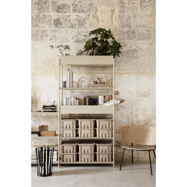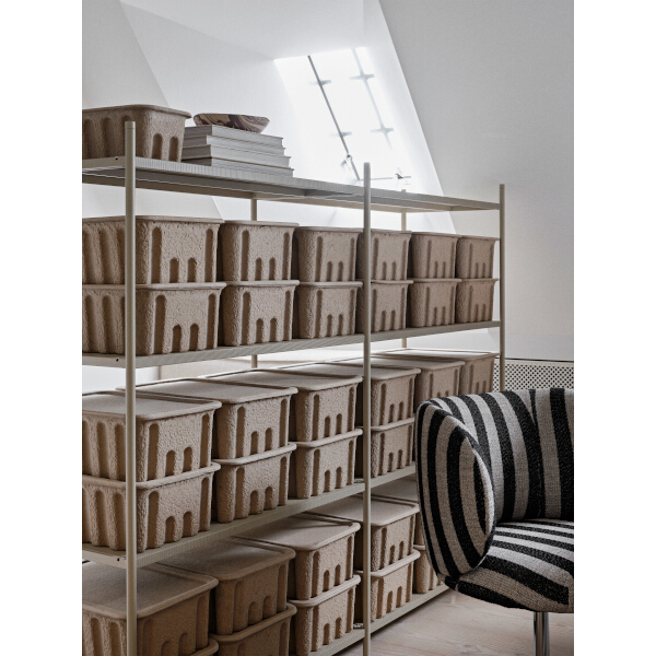 Laatikon mukana tuleva kansi varmistaa, että tavarat pysyvät poissa silmissä, mikä luo tilaan välittömästi levollisen ja selkeän tunnelman. Sen rouhea, orgaaninen pinta ja maanläheinen sävy sopivat saumattomasti skandinaaviseen sisustustyyliin.