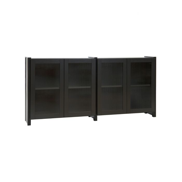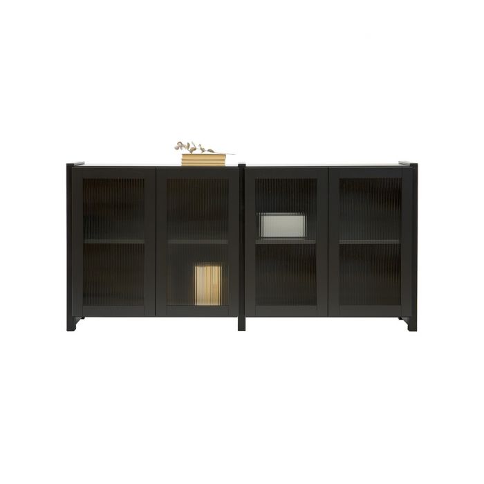 Vitriinin ilmeen kruunaavat tyylikkäät aaltolasiset ovet, jotka luovat kauniin 70-lukua flirttailevan tunnelman. Aaltolasi taittaa valoa leikkisästi, tuoden samalla esineet esiin tyylikkäästi suojaten. Käytä keittiössä astia- tai olohuoneessa katseenvangitsijana.
