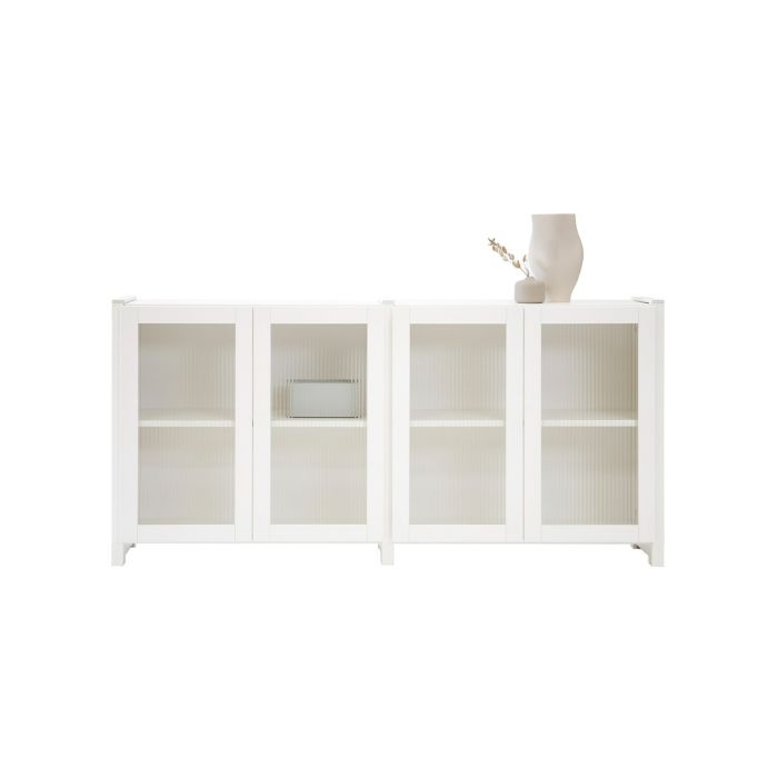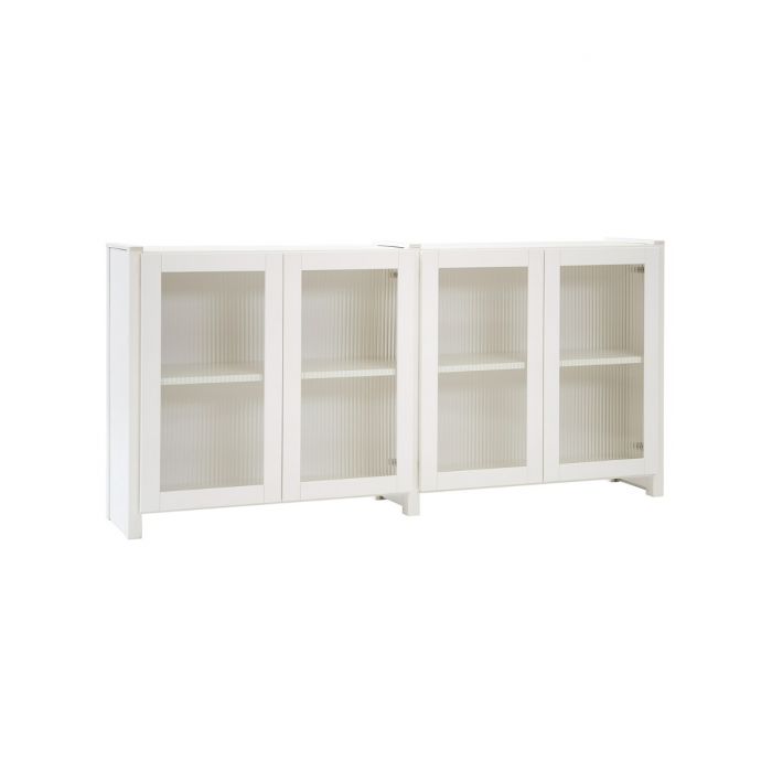 Vitriinin ilmeen kruunaavat tyylikkäät aaltolasiset ovet, jotka luovat kauniin 70-lukua flirttailevan tunnelman. Aaltolasi taittaa valoa leikkisästi, tuoden samalla esineet esiin tyylikkäästi suojaten. Käytä keittiössä astia- tai olohuoneessa katseenvangitsijana.
