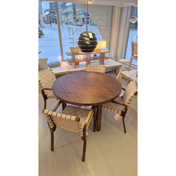 Pöydän tunnistettavin piirre on Aallon vallankumouksellinen L-jalka, joka takaa rakenteen tukevuuden ilman monimutkaisia liitoksia. Halkaisijaltaan 125 cm pyöreä pöytä on täydellinen keskipiste ruokailutilaan, kutsuen viettämään aikaa yhdessä. Se on kestävä ja ajaton valinta, joka vain kaunistuu vuosien saatossa.