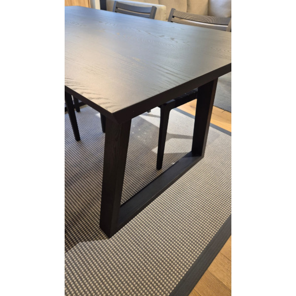 Yhdessä-ruokapöytä on tanskalaisen Kristensen & Kristensenin taidonnäyte, jossa yhdistyvät massiivipuun luonne ja moderni eleganssi. Tämä mustaksi petsattu saarni -versio on rohkea valinta: se tuo tilaan vaikuttavaa särmää säilyttäen silti puun kauniin ja elävän syyrakenteen näkyvillä.